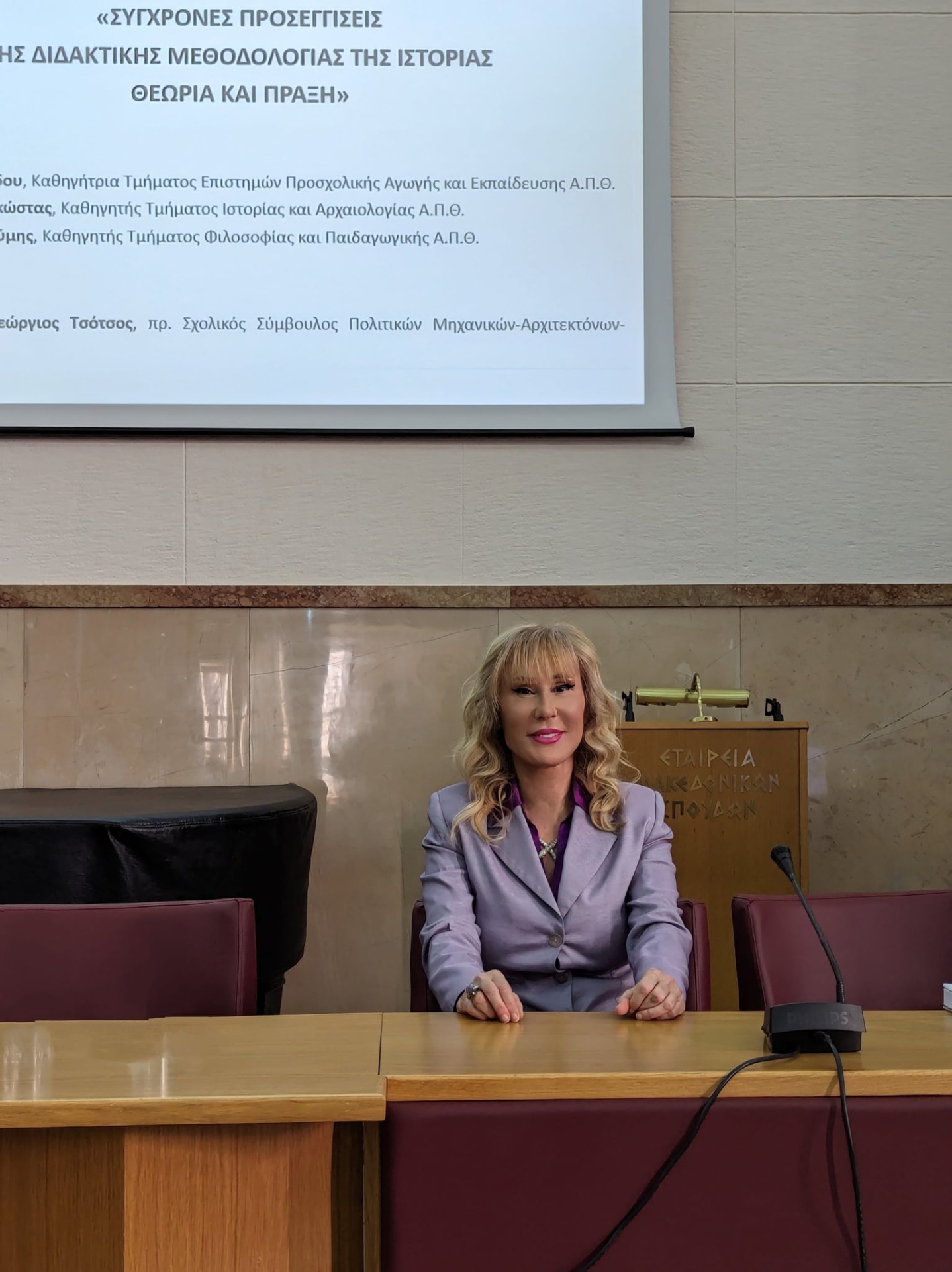 Η Δρ. Αναστασία Βακαλούδη στο βήμα της Εταιρείας Μακεδονικών Σπουδών κατά τη διάρκεια ομιλίας της – μια στιγμή που αποτυπώνει το πολιτισμικό και επιστημονικό της αποτύπωμα.