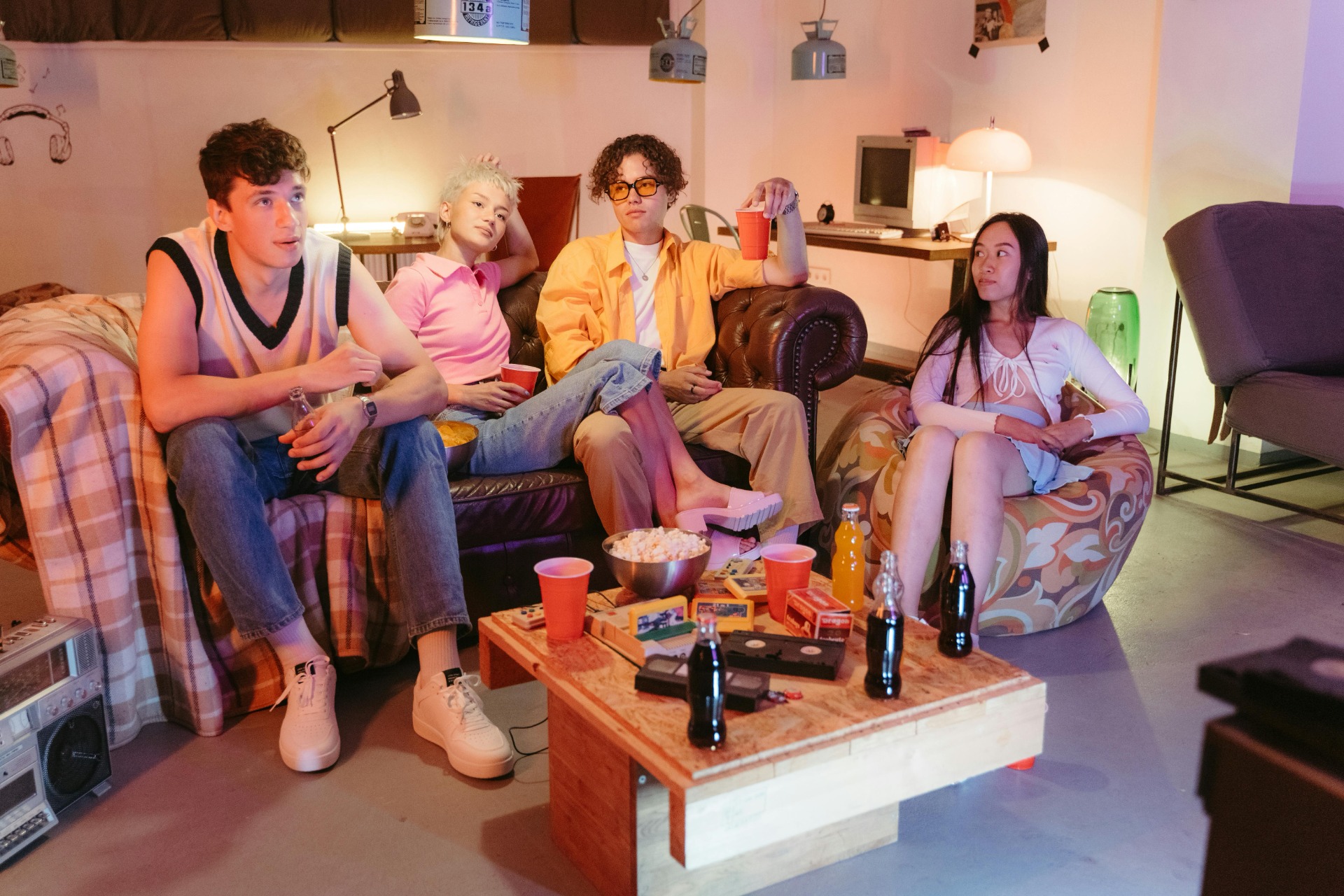 Δύο ζευγάρια απολαμβάνουν φθινοπωρινές ταινίες στο σπίτι, με τραπεζάκι γεμάτο ποπ κορν και αναψυκτικά.
