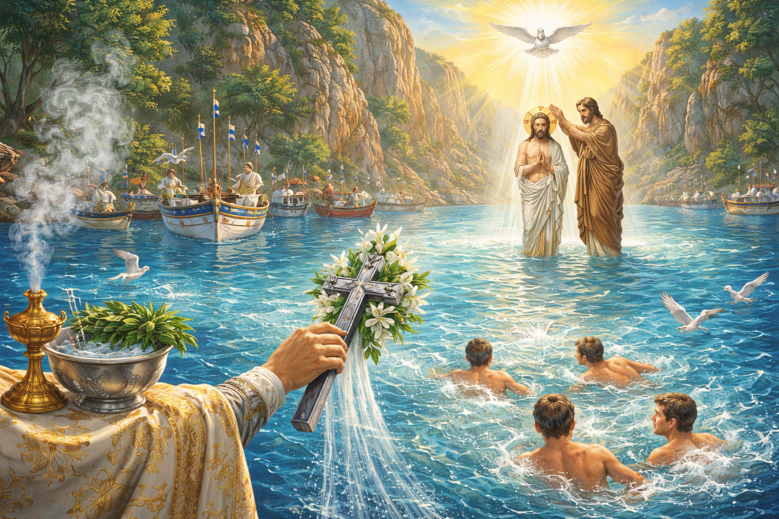 Στην ελληνική παράδοση, το έθιμο της κατάδυσης του Σταυρού στη θάλασσα και η ανάσυρσή του από τους κολυμβητές αποτελεί συγκλονιστική εικόνα πίστης και συμμετοχής. Ο νέος που θα πιάσει τον Σταυρό θεωρείται ότι λαμβάνει ιδιαίτερη ευλογία για τη χρονιά. Πίσω όμως από το λαογραφικό στοιχείο, κρύβεται βαθύ θεολογικό νόημα: ο Σταυρός, σύμβολο θυσίας και νίκης, αγκαλιάζει τα νερά, αγιάζοντας την καθημερινότητα και τη φύση.