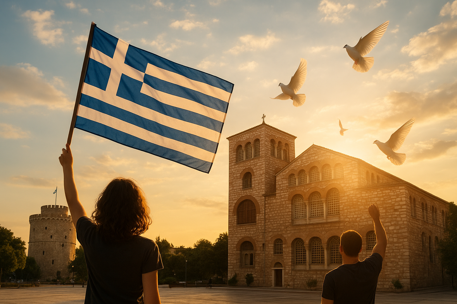 Ο Ναός του Αγίου Δημητρίου και η νέα γενιά Θεσσαλονικέων, κρατώντας την ελληνική σημαία – σύμβολο πίστης, ελευθερίας και έμπνευσης.
